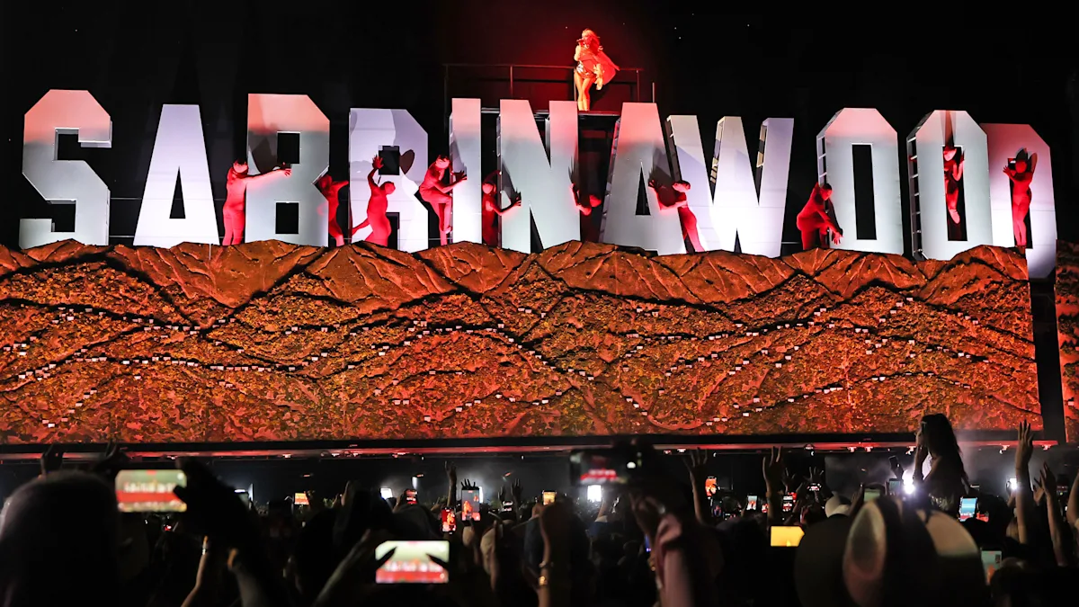 Tấm biển “SABRINAWOOD”, phiên bản Hollywood riêng của cô, xuất hiện và phủ kín màn hình trong suốt phần lớn buổi diễn. Nhưng trước đó, Sabrina dẫn khán giả qua một intro được dàn dựng như cảnh mở đầu phim với hình ảnh một cô gái ngồi trong rạp chiếu drive-in, nhìn lên màn hình, rồi quyết định tự mình trở thành ngôi sao. Cô bước xuống từ chiếc xe hơi cạnh sân khấu, tiến vào một catwalk thiết kế như đại lộ danh vọng, mở màn bằng “House Tour” trước nền Hollywood Hills tái dựng đúng kích thước thật.